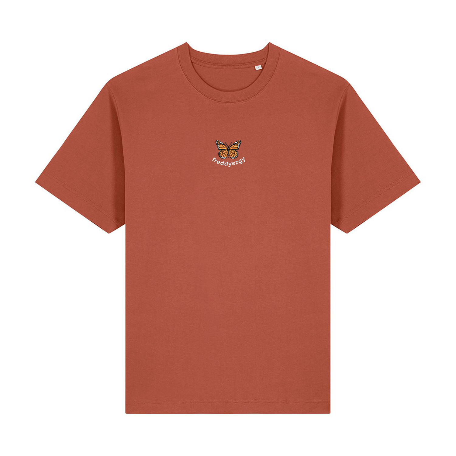 Bold wings, earthy ground. A tribute to one of nature’s great travellers, the Monarch Butterfly T-shirt features vibrant orange embroidery that speaks of movement, memory, and warmth. Freddyezgy pairs this symbol of migration with earthy tones, from terracotta-like heritage brown to raw natural beige.