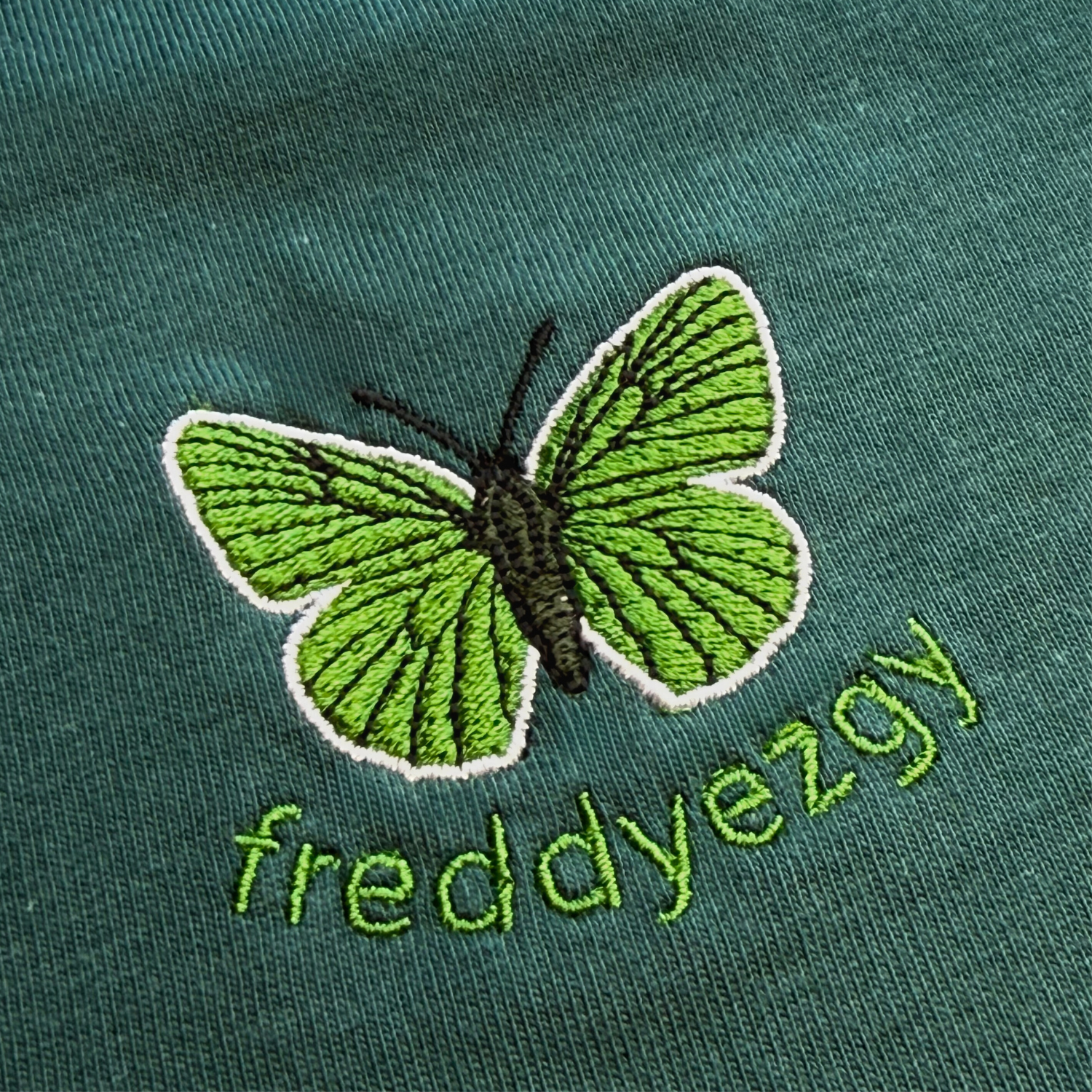 This embroidered T-shirt takes inspiration from the Green Hairstreak Butterfly — one of nature’s most quietly striking butterflies. Chosen by Freddyezgy not for its loud colours, but for its subtle power. It’s the kind of detail you almost miss… but once seen, it stays with you. Not all green is the same. Some carry stillness; others spark curiosity.