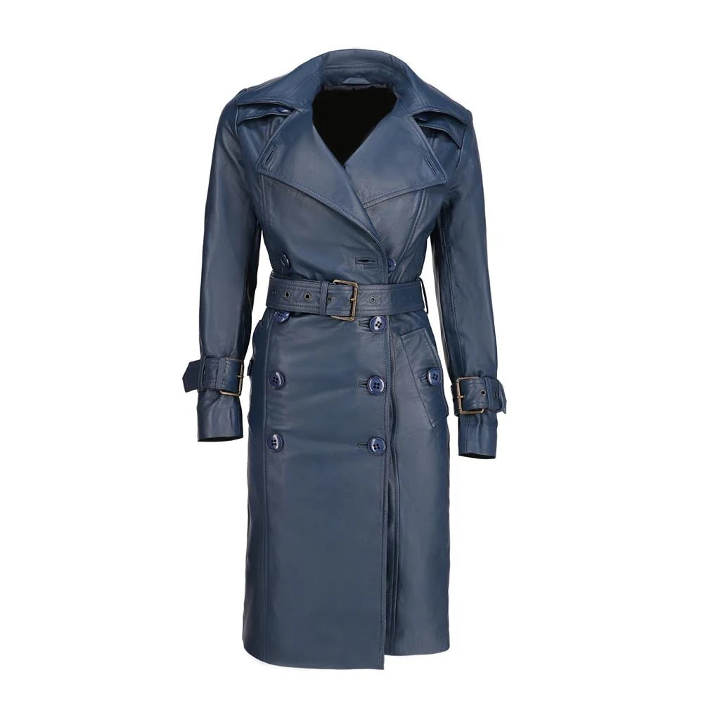 Womens Double Breasted Leather Trench Coat | Blue