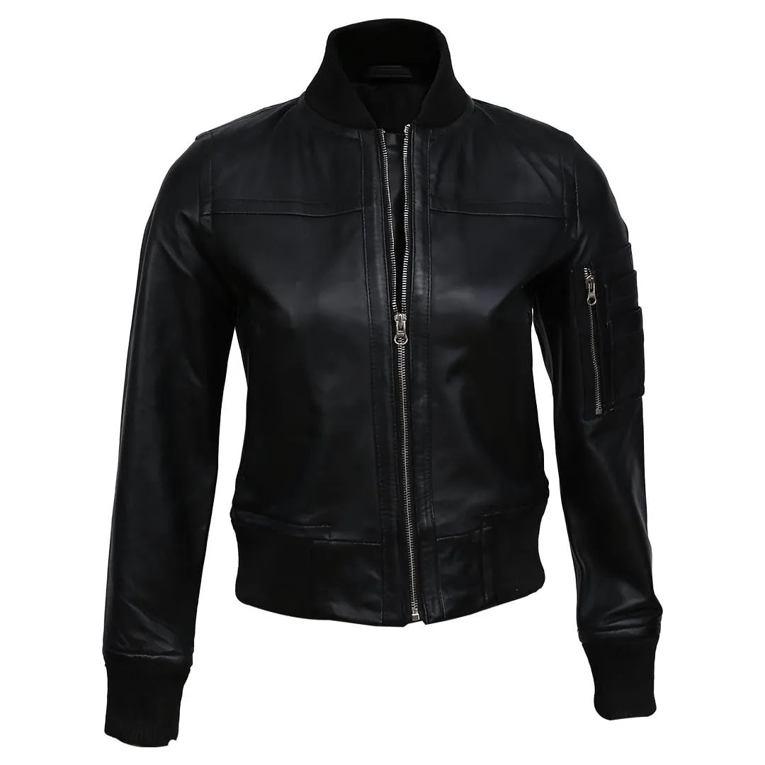 Elevate your style with this sleek and sophisticated women's real sheep leather bomber jacket. Crafted from premium-quality leather, this jacket boasts a timeless black hue that effortlessly complements any outfit. The streamlined silhouette, complete with a stand-up collar and ribbed cuffs and hem, exudes an urban-chic vibe. Multiple zippered pockets offer convenient storage, while the dual front zippers add a touch of edge. Whether you're running errands or hitting the town, this versatile jacket will keep you looking sharp and feeling comfortable. Its durable construction ensures lasting wear, making it a worthwhile investment for your wardrobe. Embrace the perfect blend of fashion and functionality with this must-have leather bomber jacket.